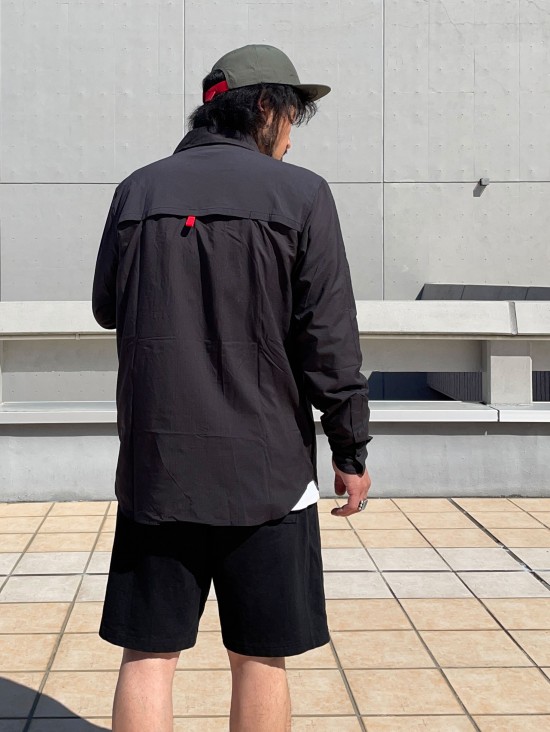 軽量で薄手なナイロン素材のシャツで、都会的な仕上がりです。