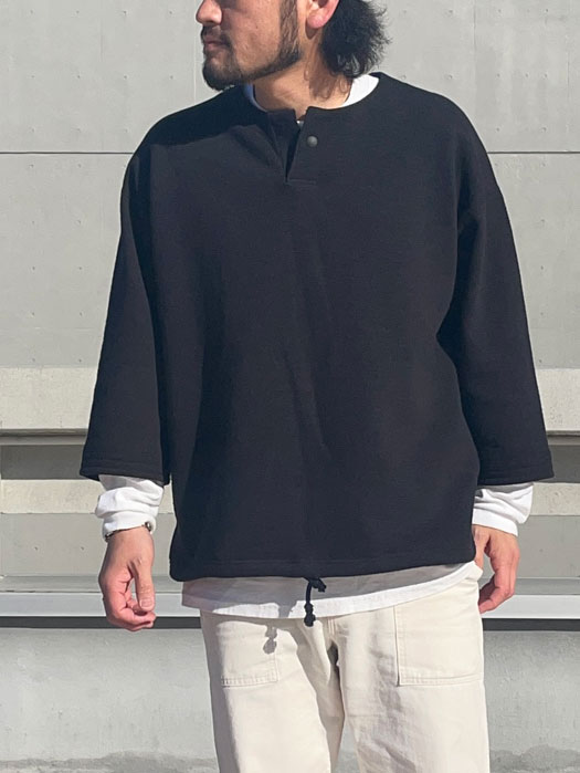 ヘンリーネックと7分袖が特徴で、素材には肉厚でありながらも柔らかさを併せ持つスウェット地を採用。
