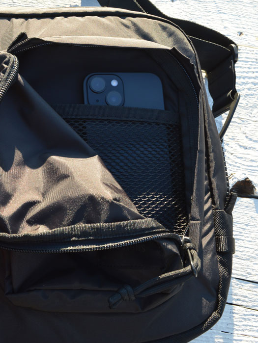フロントに2つある立体ポケットが特徴で、U字に大きく開くメイン収納と独立したPC収納(15インチ対応PCスリーブ)を備えた2気室構造。