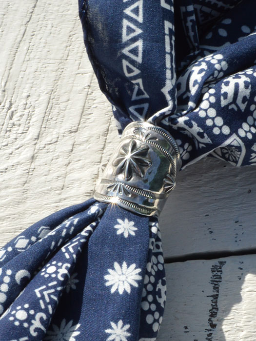 バンダナなどスカーフを首に巻いて、このスカーフリングを通して使うと本当に良い雰囲気で使って頂けます。