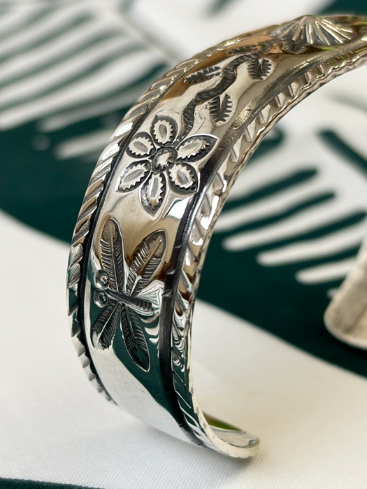 中央にはシェルが施され、そこから左右に広がるフラワー、両サイドのドラゴンフライなどネイチャーモチーフがよりリアルさを感じる仕上がりです。