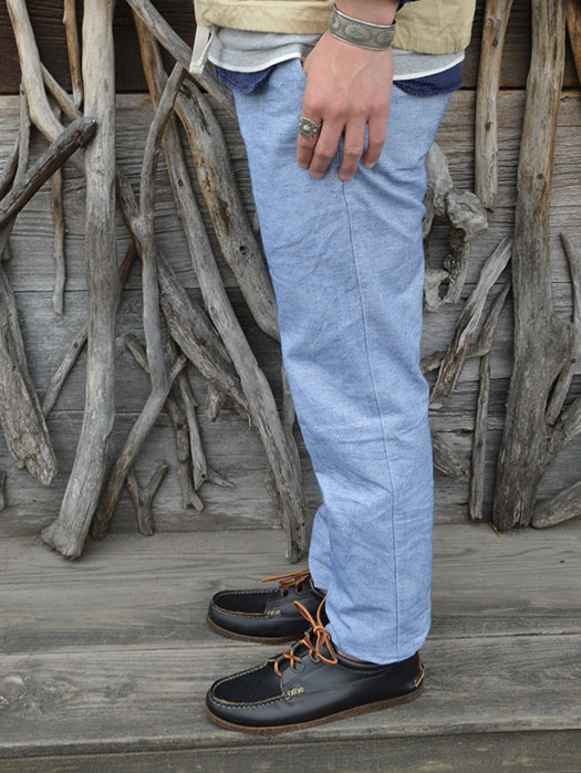 すっきりとしたわりと細身のシルエットでベーシックなチノスタイル、生地にはムラ感が表情あるオクッスフォードで雰囲気良く、夏でも快適に穿いて頂けます。